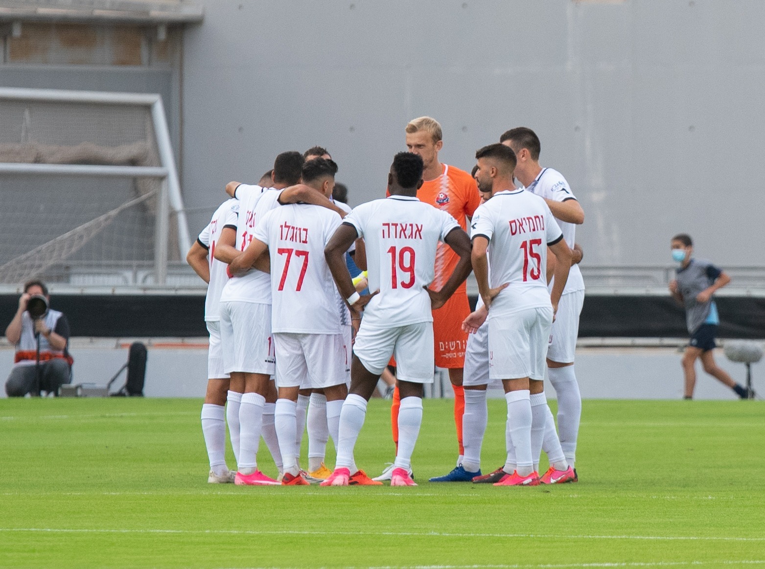 10. בתמונות (צילם שמיל שמילוביץ): שתי תמונות של דבוקות השחקנים רגע לפני תחילת המשחק,