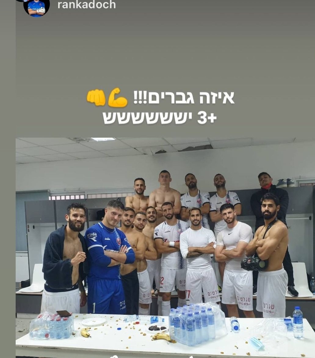 16. שולחן הניצחון: באחד מהתמונות שפורסמו מייד אחר המשחק באשדוד מתוך חדר ההלבשה – נצפו שחקני הקבוצה בתמונה קבוצתית מגובשת של יחידה לוחמת.