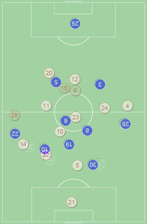 והשחקנים עסוקים בירידה של כולם (למעט החלוץ) לעמדות המוצא ההגנתיות שלהם, בעיקר מאחורי הכדור. זה לא מספיק: