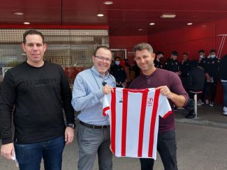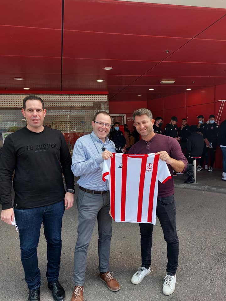 מנכ"ל המועדון רובי רגב והסמנכ"ל איתי רק העניקו במתנה לפרופ' וייס את חולצת הרטרו הייחודית שהשיק המועדון.