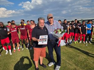 הבעלים של המועדון יואב כץ העניק את ספר המאה ובו פרק מיוחד על אגדת האחים סימנדיריס ואילו הבעלים של לאריסה אקילס העניק זר פרחים לכץ.