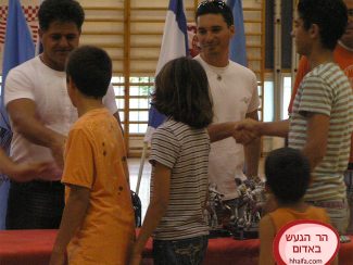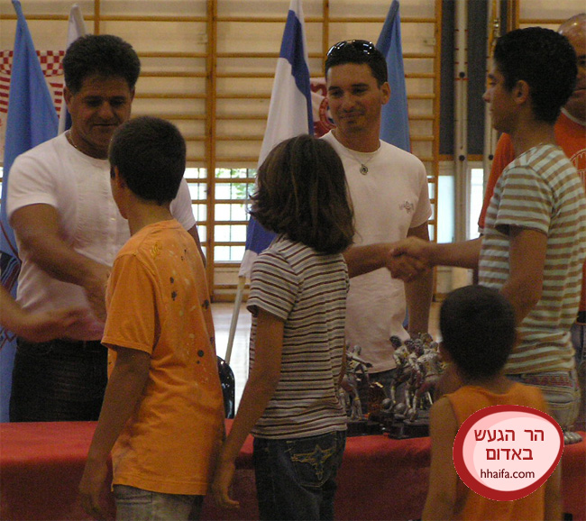 שלומי דורה (ימין) ואפרים גבאי מעניקים גביעי למצטייני מחלקת הנוער. (צילום: הראל אלימלך).