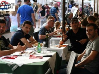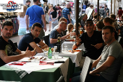 שחקני הקבוצה יחד עם מאמן השוערים סועדים במסעדה מקומית. (צילומים: יובל לב)