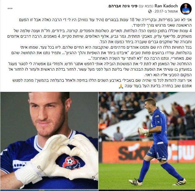 השוער פרסום פוסט פרידה ברשתות החברתיות מחבריו לקבוצה ומהאוהדים : "אני לא טוב בפרידות, ובקריירה של 18 עונות בבוגרים (והיד עוד נטויה)