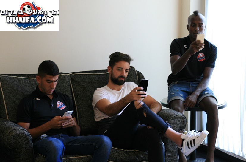 פיניירו (במרכז) יחד עם חבריו לקבוצה, מתעדכנים עם בואם למלון. (צילום: יובל לב).