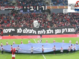 אוהדי הפועל חיפה בתצוגה לזכרו של רובי שפירא. (צילום: יובל לב)