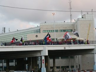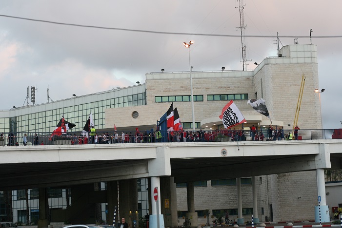 אוהדי הקבוצה מגיעים למתחם הנמל עם דגלי ענק.