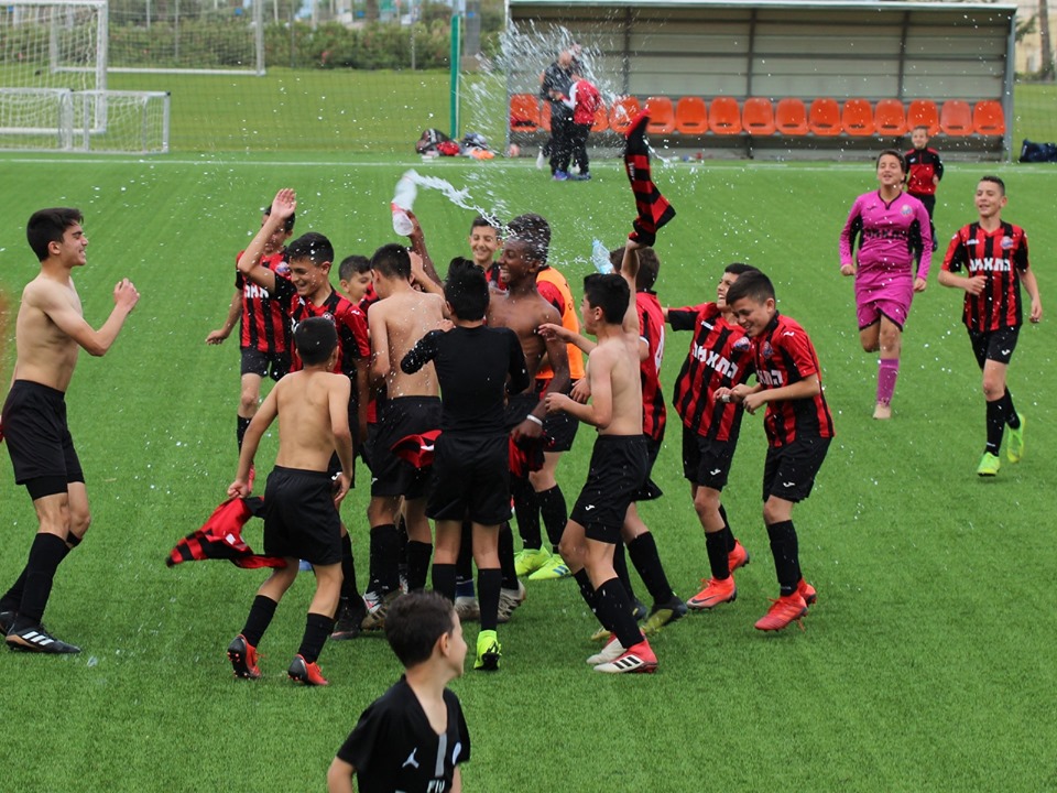 שחקני קבוצת ילדים ב' עם מאמנם רם בן מיכאל חוגגים עוד ניצחון. (צילום: הפועל חיפה)